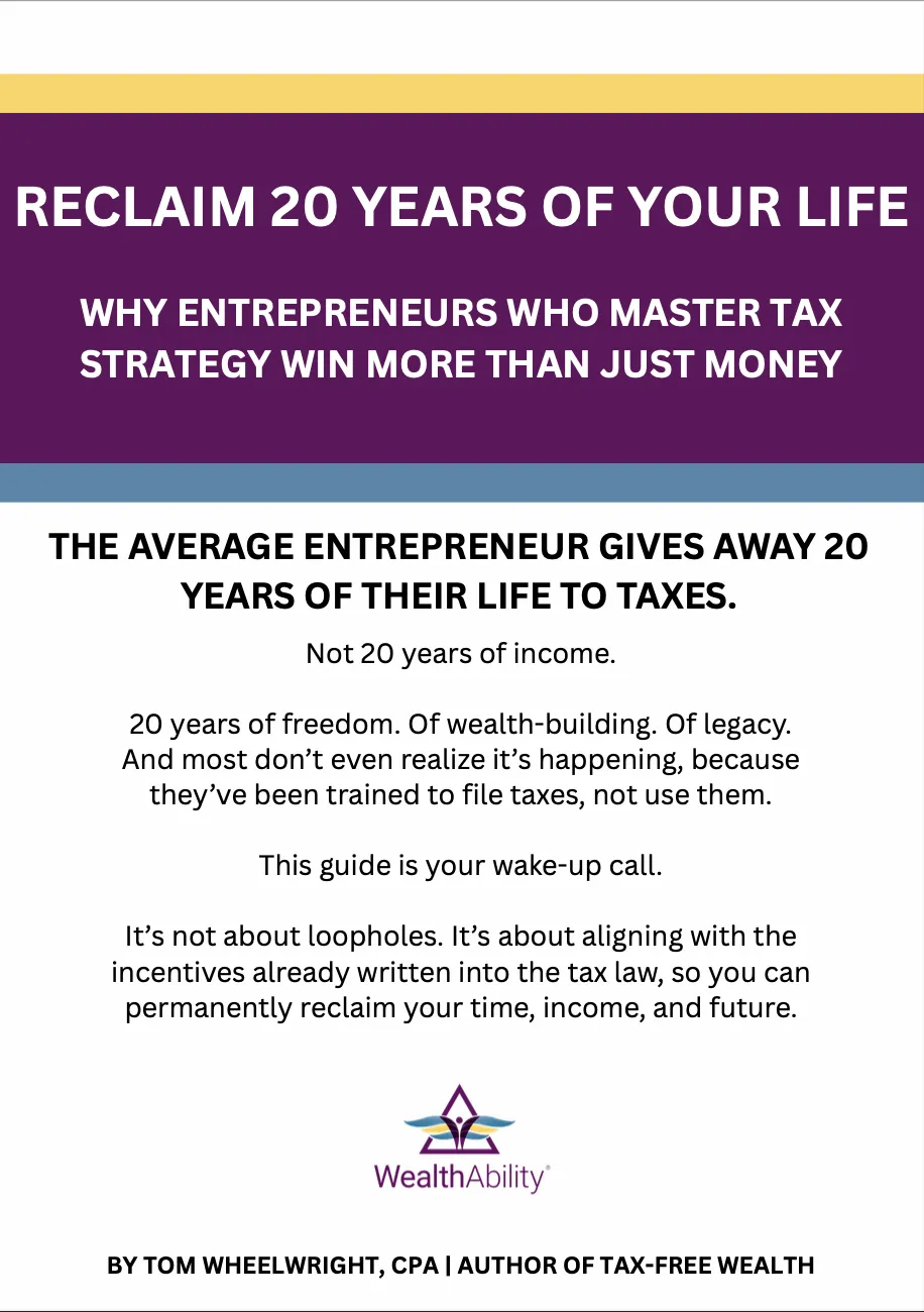 Tom Wheelwright’s results, strategies, and experiences are not typical and are not a guarantee of your financial success. WealthAbility® does not promise or imply any guaranteed outcomes, whether in tax savings, wealth building, or business growth, based on the use of our education, systems, or services. Individual results will vary widely depending on factors including personal effort, financial situation, business model, and market conditions. All content presented on this website, including but not limited to tax strategies, videos, frameworks, and written material, is the intellectual property of WealthAbility®, LLC. Unauthorized use, reproduction, or distribution of any material without express written consent is strictly prohibited.